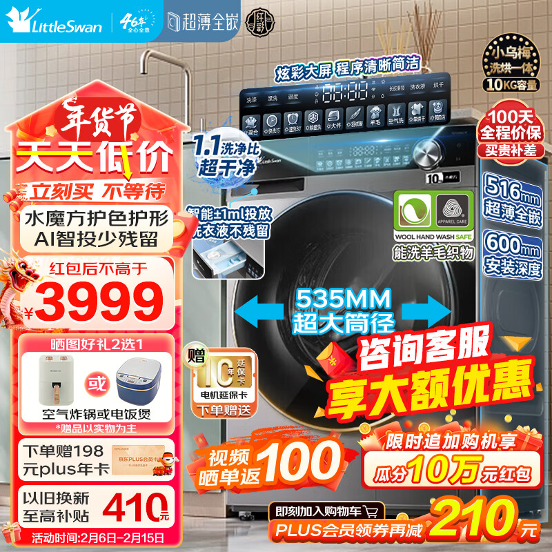 小天鹅(LittleSwan)滚筒洗衣机全自动 10公斤洗衣机烘干机一体机 水魔方 小乌梅 超薄全嵌 智能投放 大筒径 TD100SC18价格:3999.00元!