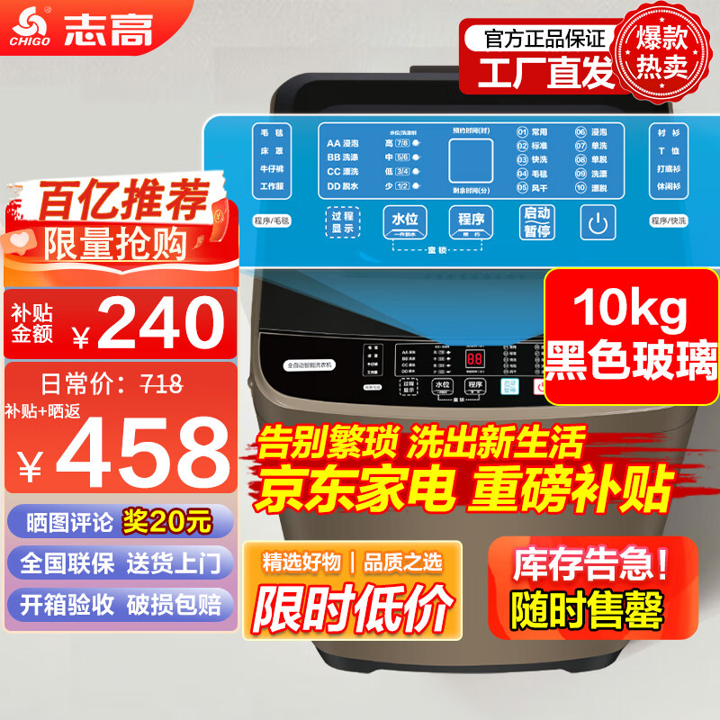 志高(CHIGO)洗衣机10公斤大容量家用全自动波轮洗衣机智能洗脱一体机蓝光洗护强劲电机升配黑色玻璃盖板 金色价格:518.00元!