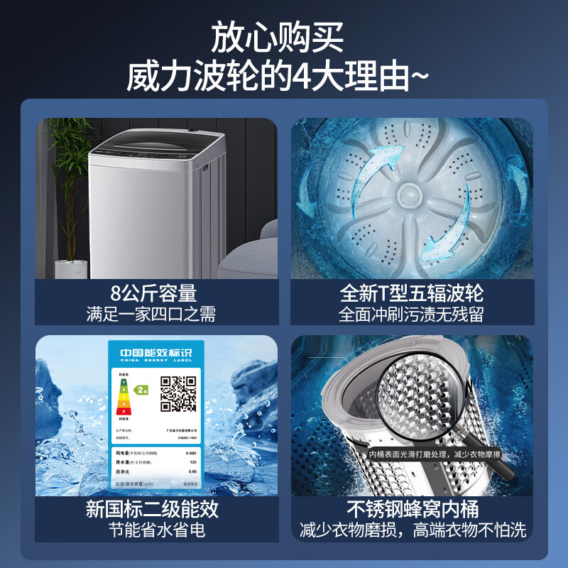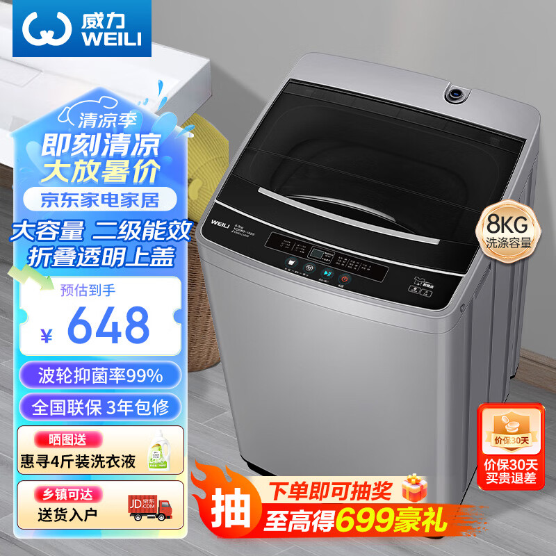 威力(WEILI)8公斤 波轮洗衣机全自动大容量 13分钟快洗 10档水位 护衣内筒防锈箱体 以旧换新XQB80-1999价格:649.00元!