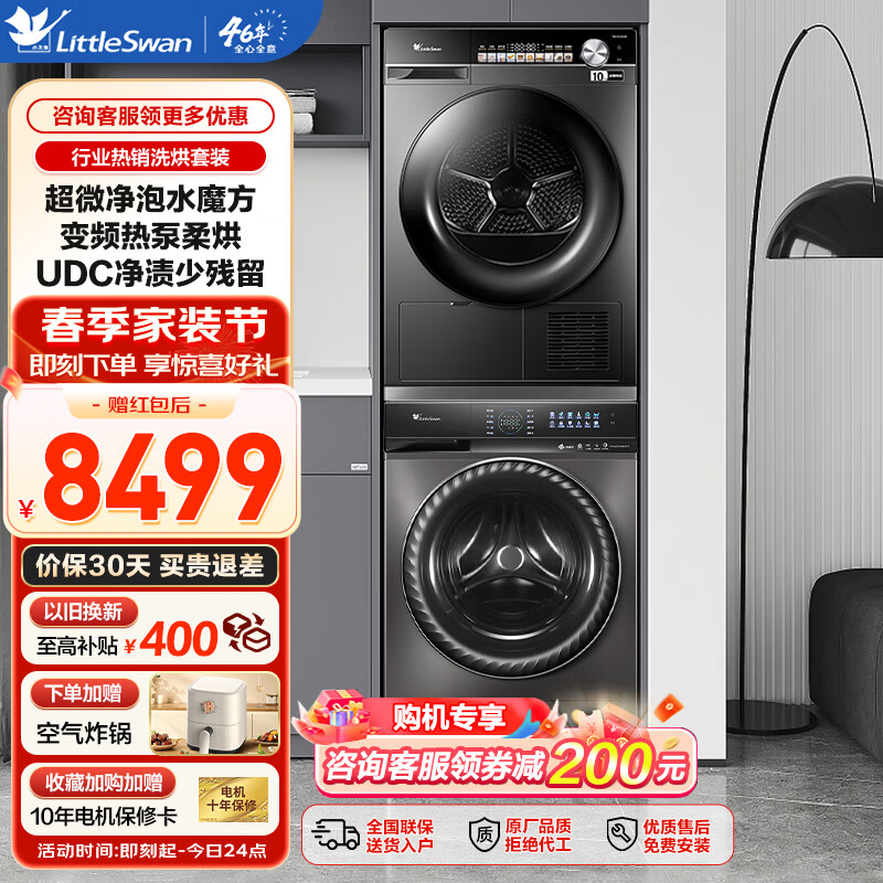 小天鹅(LittleSwan)小钢炮洗烘套装 超微净泡水魔方滚筒洗衣机 10公斤变频热泵烘干衣机189+81价格:8699.00元!