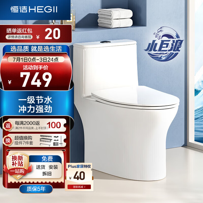恒洁(HEGII)马桶513 家用虹吸小巨浪马桶节水小户型卫生间坐便器HC0513PT-305价格:1249.00元!