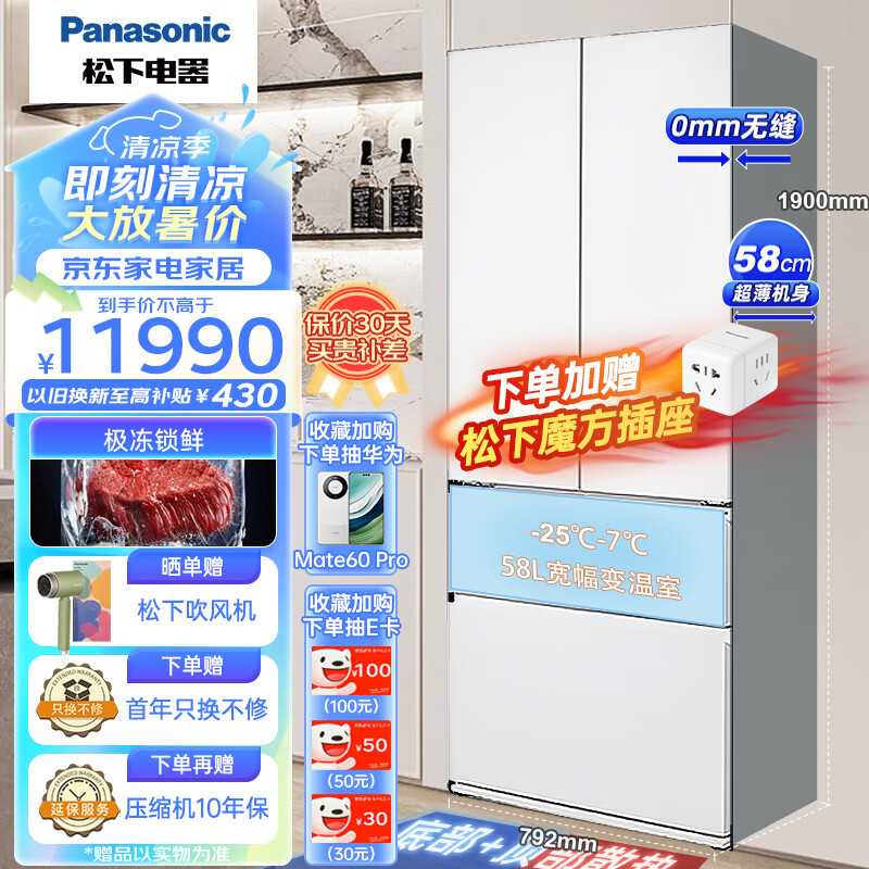松下(Panasonic)大白PRO 464升家用多门冰箱一级能效四开门大容量580mm超薄嵌入法式冰箱NR-EW46TGB-W月光石价格:11990.00元!