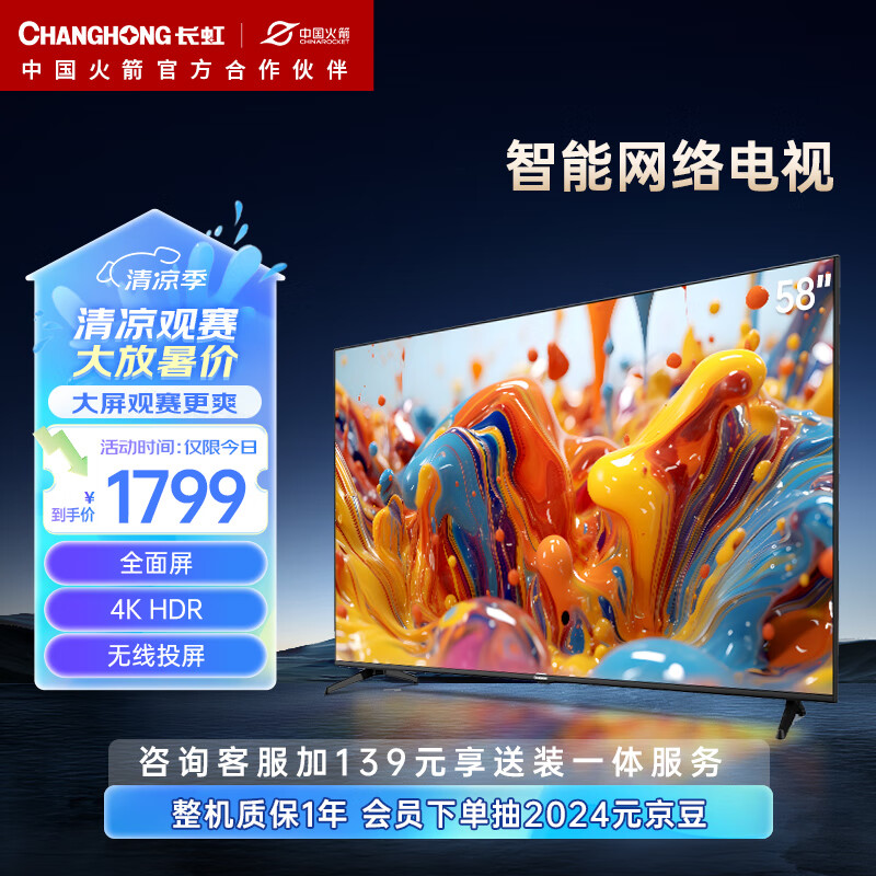 长虹电视58D4PS 58英寸屏 网络智能 4K超高清HDR 平板LED液晶电视机(黑色)价格:1799.00元!