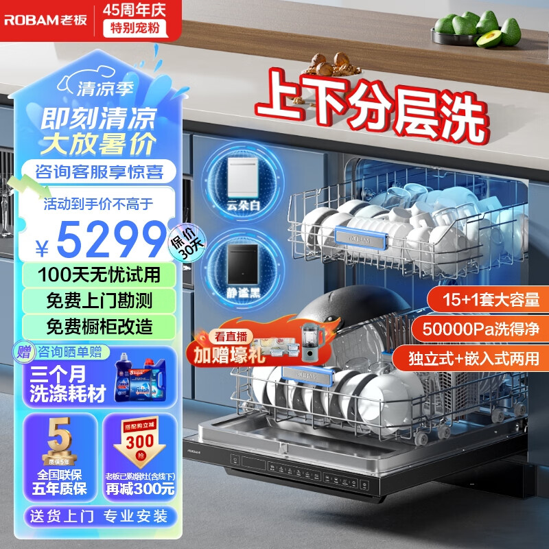 老板(Robam)F80D黑洗碗机15+1套去重油污嵌入式热风烘干消杀168h长效存储一体机家用独立式分层洗价格:5299.00元!
