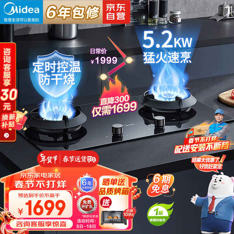 美的(Midea)美颐享 燃气灶天然气 双灶具三防灶 家用5.2kW猛火灶台嵌两用 防干烧定时灶 智能温控 Q715K-X1价格:1699.00元!
