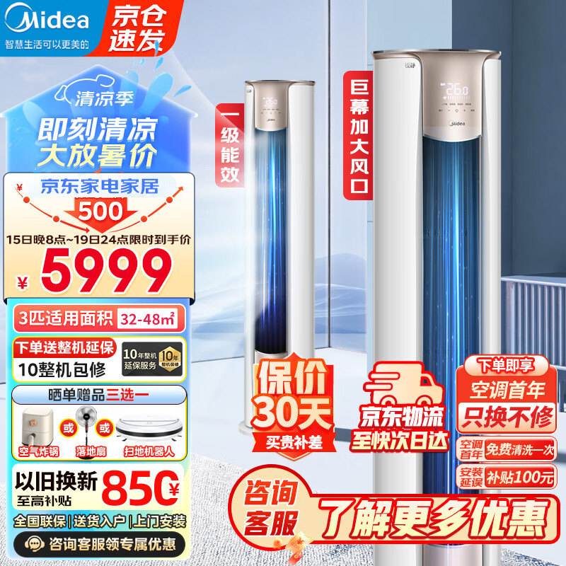 美的(Midea)空调3匹锐静 新一级能效 变频冷暖 自清洁 客厅空调 立式空调柜机 KFR-72LW/N8VHC1Ⅱ价格:5999.00元!