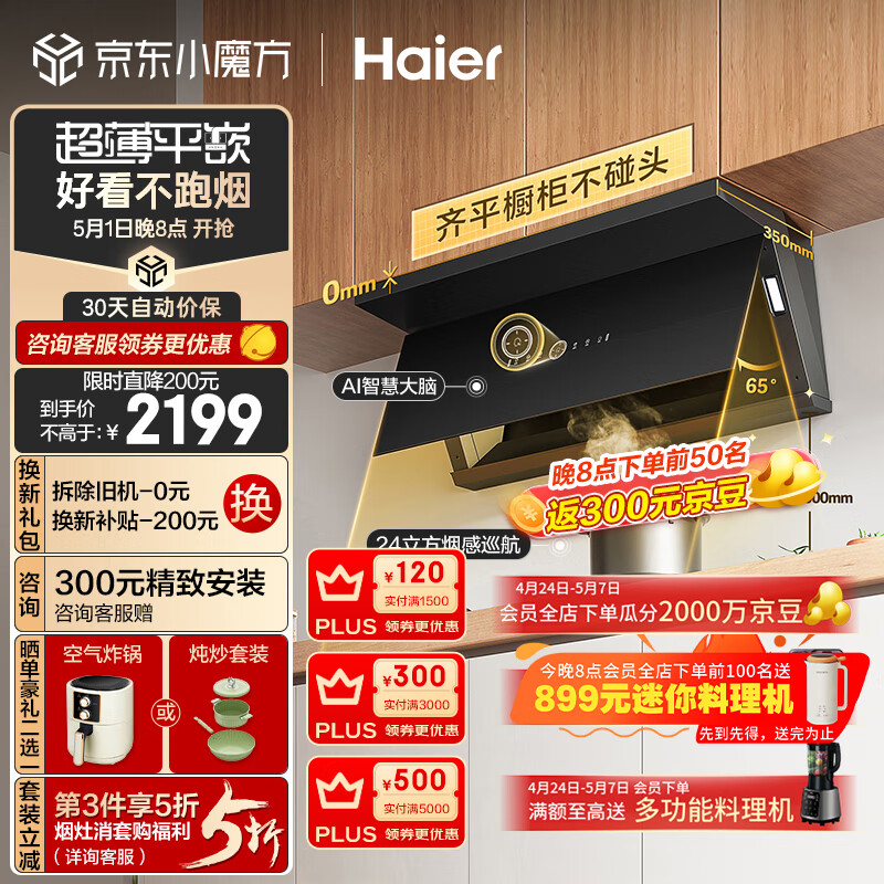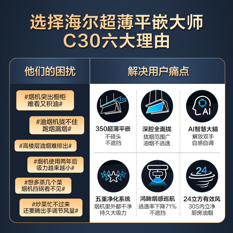 海尔(Haier)抽油烟机 超薄近吸 家用吸油烟机 24m3/min有效风 烟感巡航 顶侧双吸外观 厨房排烟机C30价格:2399.00元!