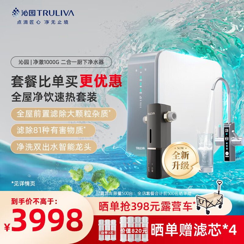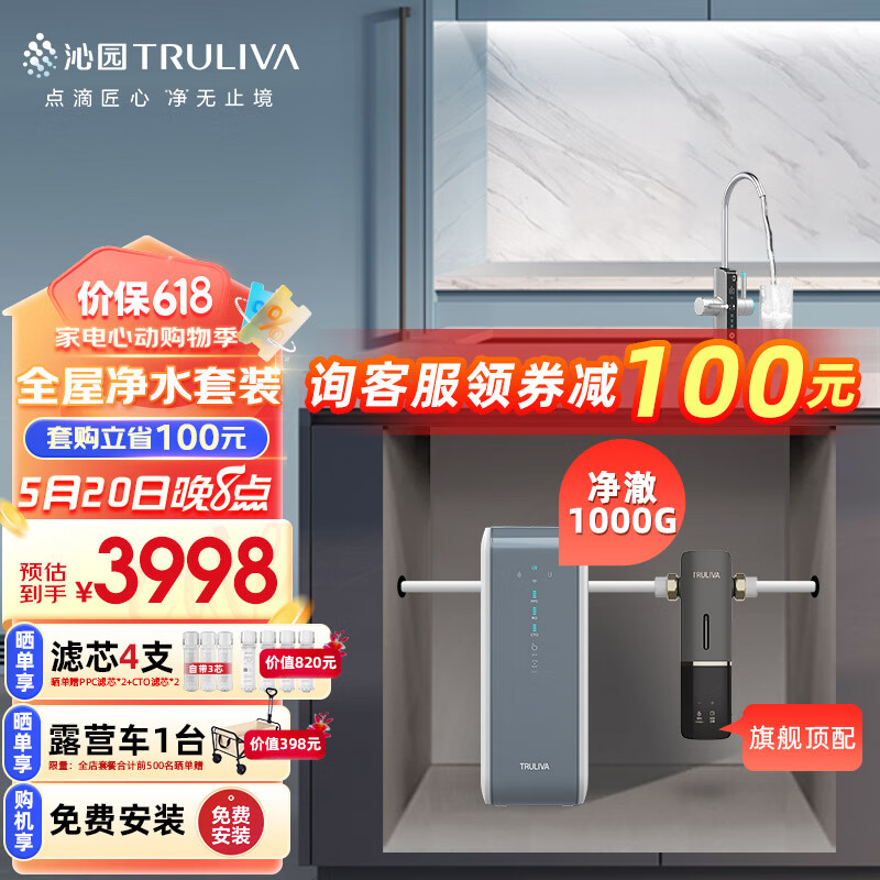 沁园(TRULIVA)净澈双出水1000G 二件套装 净水器UR-SX51070+智能自动冲洗前置过滤器P-O7712价格:4698.00元!