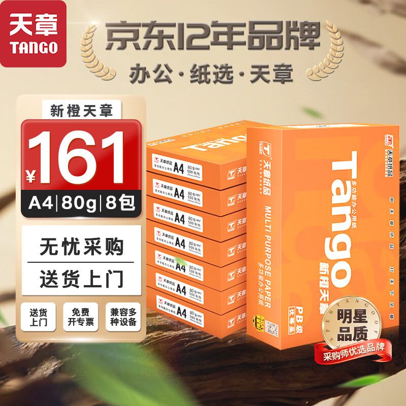 天章 (TANGO)新橙天章A4打印纸 80g 500张*8包 双面打印复印纸 顺滑不卡纸高性价比 整箱4000张【明星品质款】价格:161.00元!