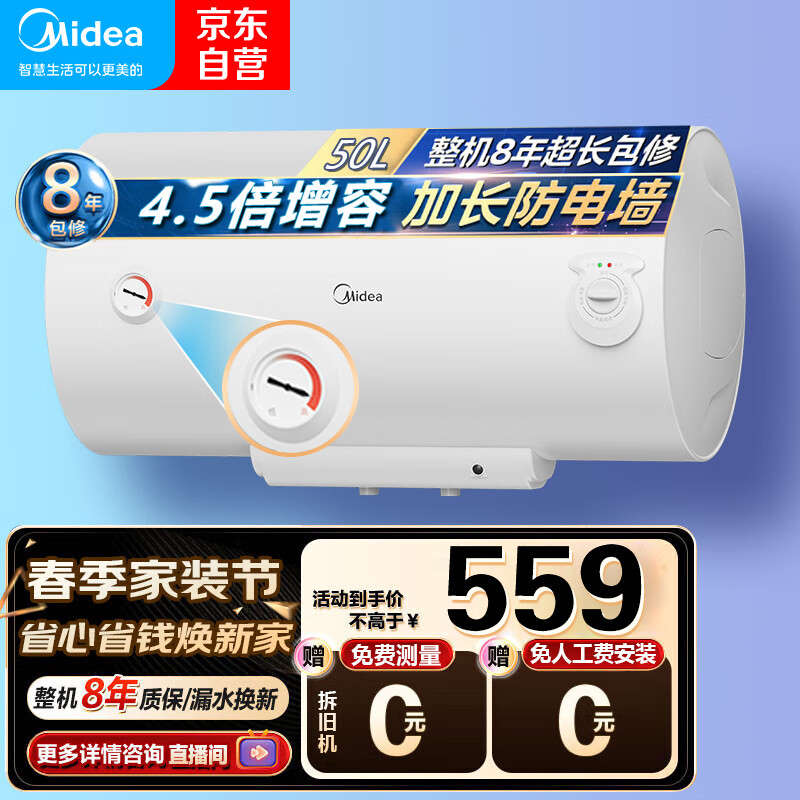 美的(Midea)电热水器 家用储水式 节能省电速热 漏水换新机 双重防漏电防电墙卫生间租房F50-A20MD1(HI)价格:559.00元!