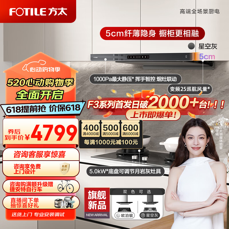 方太(FOTILE)F3纤薄抽吸油烟机灶具套装 欧式顶吸超薄烟机燃气灶 25巡航风量变频 烟灶联动灰色套餐F3-G+THF1-G价格:5399.00元!
