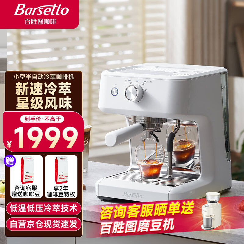 Barsetto百胜图意式半自动冷萃咖啡机小型咖啡机 智能控温 泵压浓缩萃取 一体式蒸汽打奶泡机BAE-M2C极昼白价格:2599.00元!