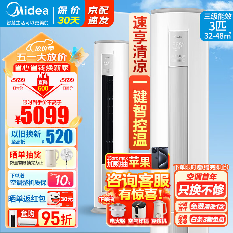 美的空调3匹柜机 智行Ⅱ 新能效变频冷暖 强劲除湿 客厅空调立式 自清洁+智能控温 KFR-72LW/N8MJA3Ⅱ价格:5099.00元!