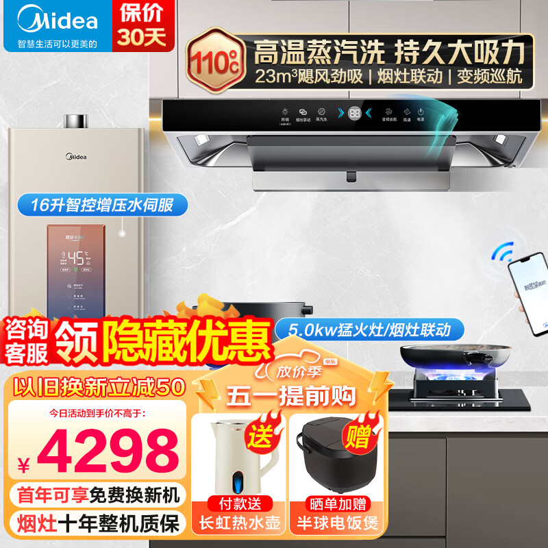 美的(Midea)抽油烟机 23大吸力欧式顶吸式烟灶联动高温蒸汽洗 油烟机燃气灶具热水器厨房三件套装TZ07+523+MK3价格:4298.00元!
