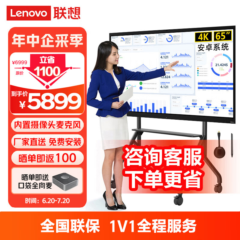 联想thinkplus 会议平板一体机65英寸触摸屏 智能电子白板视频会议教学电视BM65+笔+投屏器+移动支架价格:5999.00元!