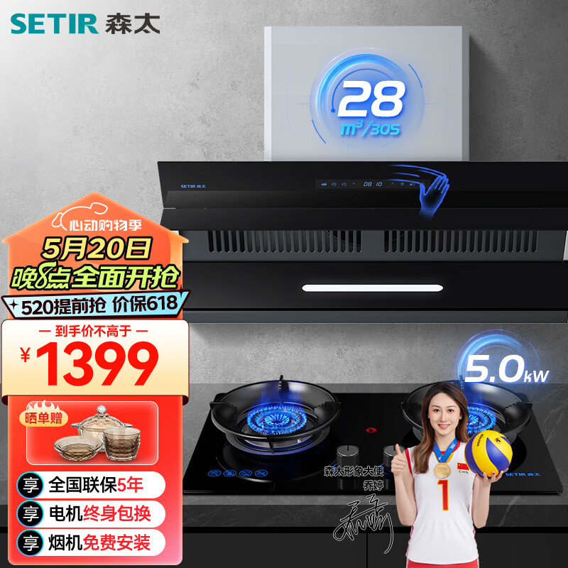 森太(SETIR)侧吸式抽油烟机烟灶套装 1050Pa变频大吸力家用吸油烟机5.0kW聚能猛火灶具 B690BQSL+TA19液化气价格:1599.00元!