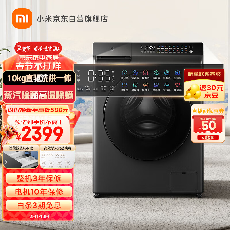 米家小米出品滚筒洗衣机全自动 10kg直驱洗烘一体 直驱电机节能低噪智能投放炫彩触控屏 XHQG100MJ102S价格:2399.00元!