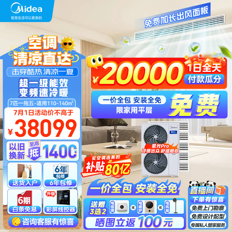 美的(Midea)中央空调一拖五风管机7匹多联机新一级能效全直流变频智能静音冷暖节能嵌入式星光pro价格:38199.00元!