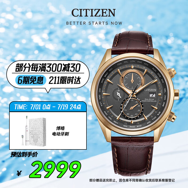 西铁城(CITIZEN)手表男日韩表光动能电波日显简约皮带商务父亲节礼物AT8263-10H价格:3339.00元!