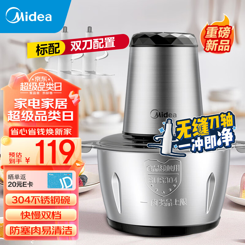 美的绞肉机家用 电动多功能绞馅机不锈钢碎肉机料理搅拌打肉饺子肉馅蒜蓉机全钢搅肉机MJ-JC32价格:119.00元!
