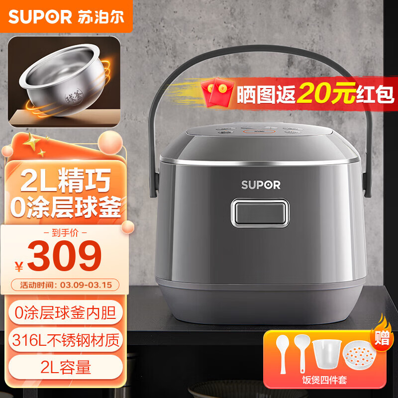 苏泊尔(SUPOR)迷你小容量家用电饭煲 2L小升数 不锈钢球釜内胆1-2-3个人多功能无涂层电饭锅智能预约 SF20FC615A 2L价格:349.00元!