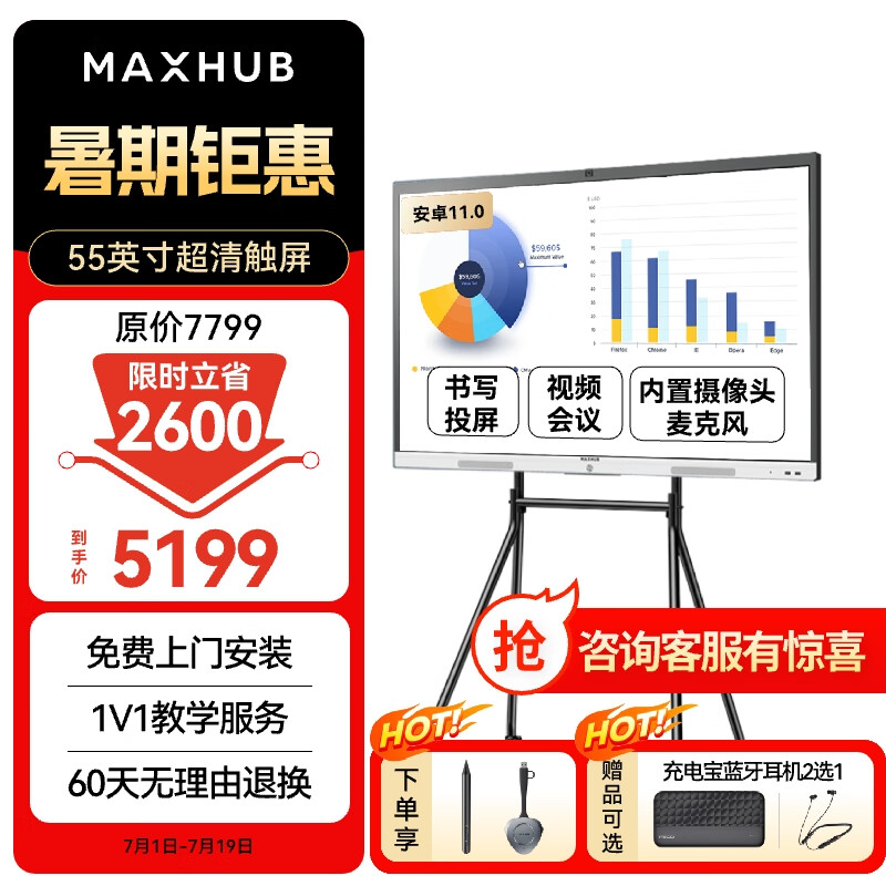 maxhub新锐55英寸 会议平板一体机 会议显示器 投影电视一体机商用显示器 电子白板黑板教学会议 电视触控屏价格:5199.00元!