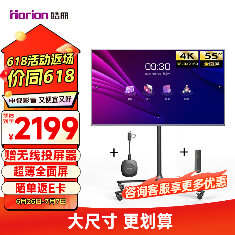 皓丽(Horion)55英寸会议平板电视一体机智慧屏投屏投影电视一体机商用显示会议室教学培训大屏55H5标配桌面底座价格:2199.00元!