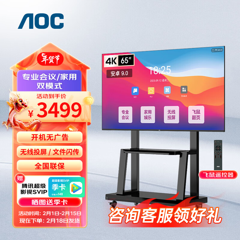 AOC会议电视4K超清会议平板一体机移动电视会议室显示屏投影投屏商用电视多媒体一体机智能显示智慧屏65英寸65NV+移动支架价格:3499.00元!