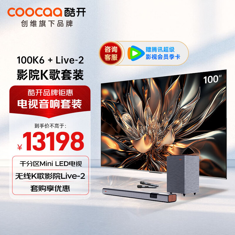 酷开创维100K6 100英寸电视机+Live-2音响 独立低音炮 回音壁 麦克风客厅家庭影院级娱乐体验套装价格:13198.00元!