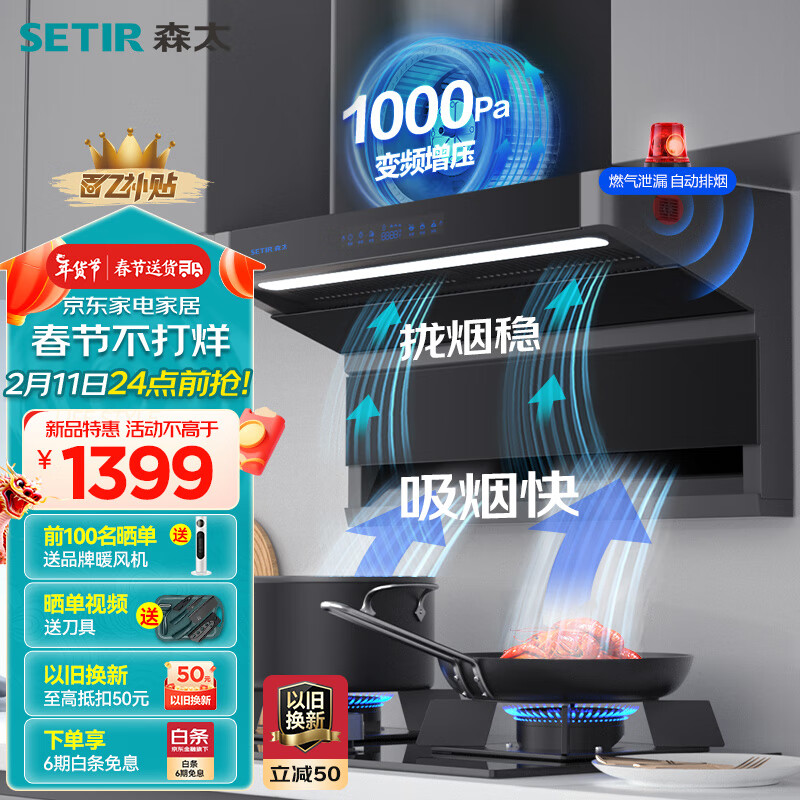 森太(SETIR)抽油烟机 顶侧双吸直流变频7字型油烟机1000Pa增压家用吸油烟机 【挥手控制+烟感监测】B813BQL 【28立方智能变频】价格:1399.00元!