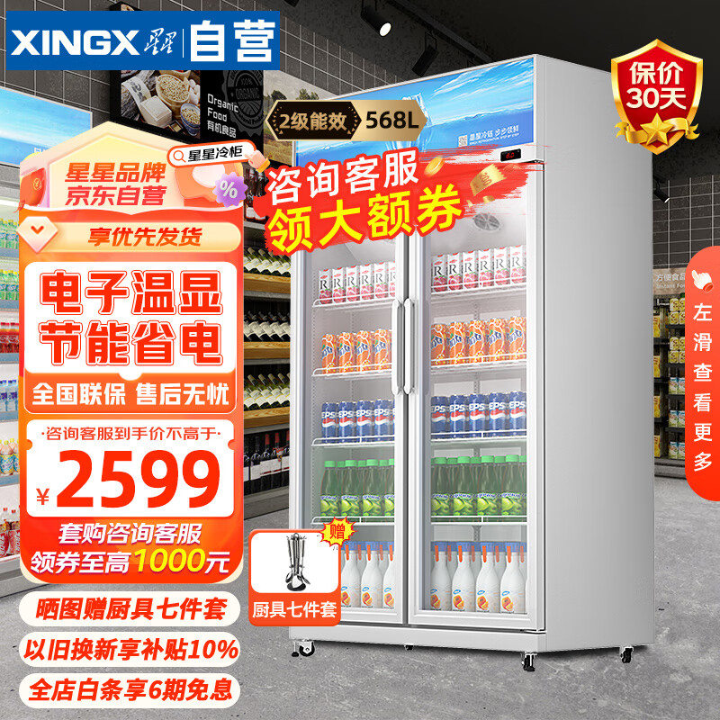 星星(XINGX)568升双门风直冷展示柜 立式玻璃冷藏保鲜柜大容量超市饮料柜节能省电 电子温显 LGC-1000FYE价格:2999.00元!