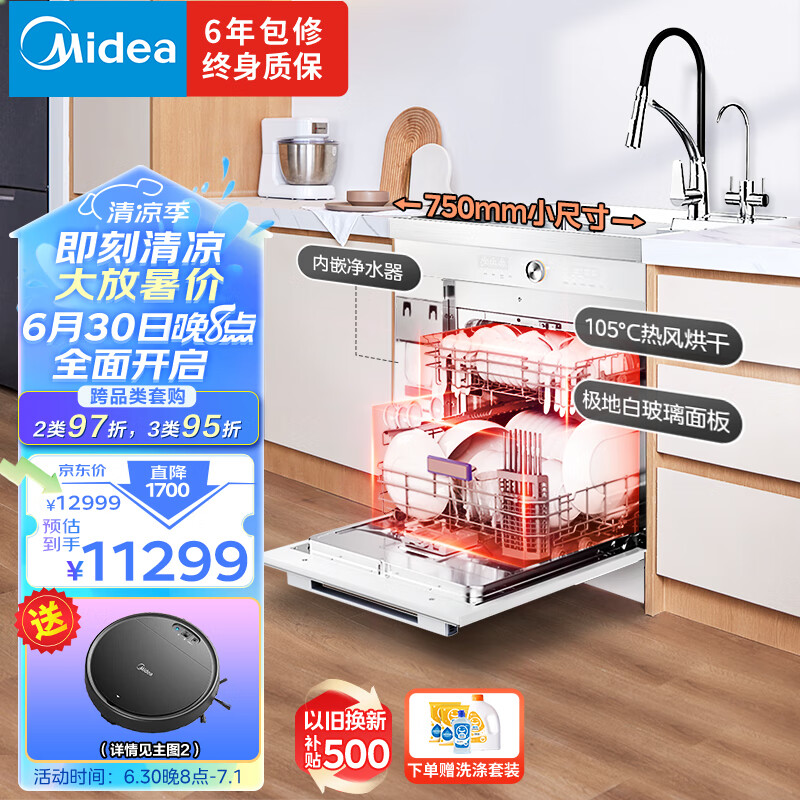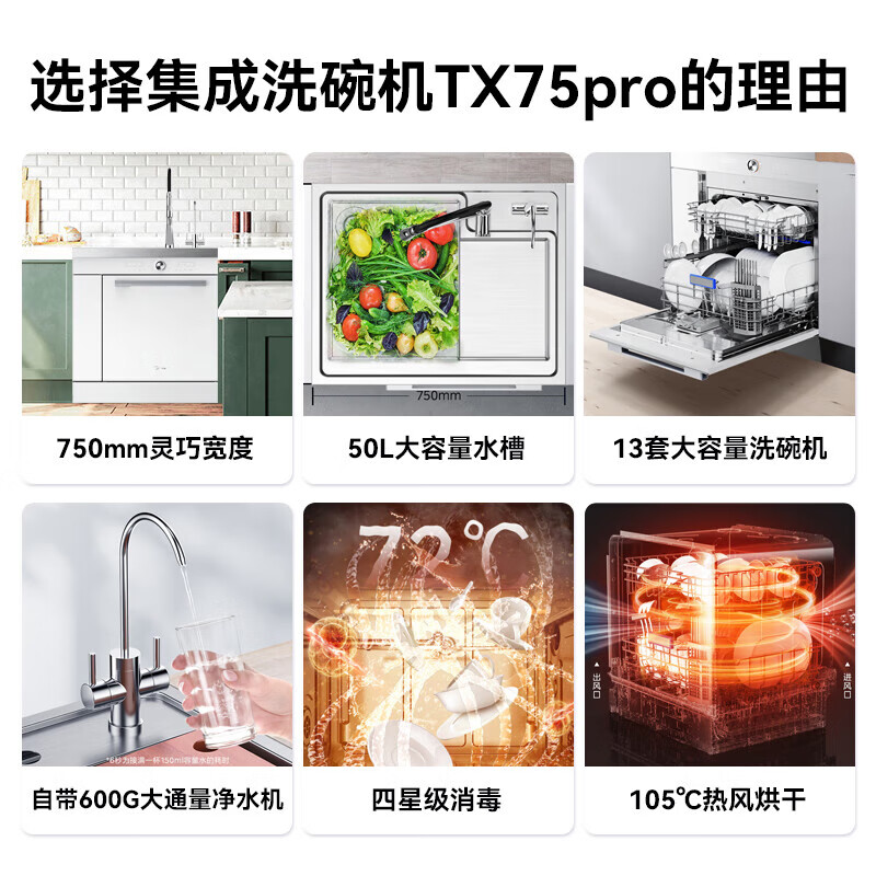 美的(Midea)集成水槽洗碗机一体 内嵌净水器 750mm宽 13套大容量 轻奢白色款TX75Pro价格:11299.00元!