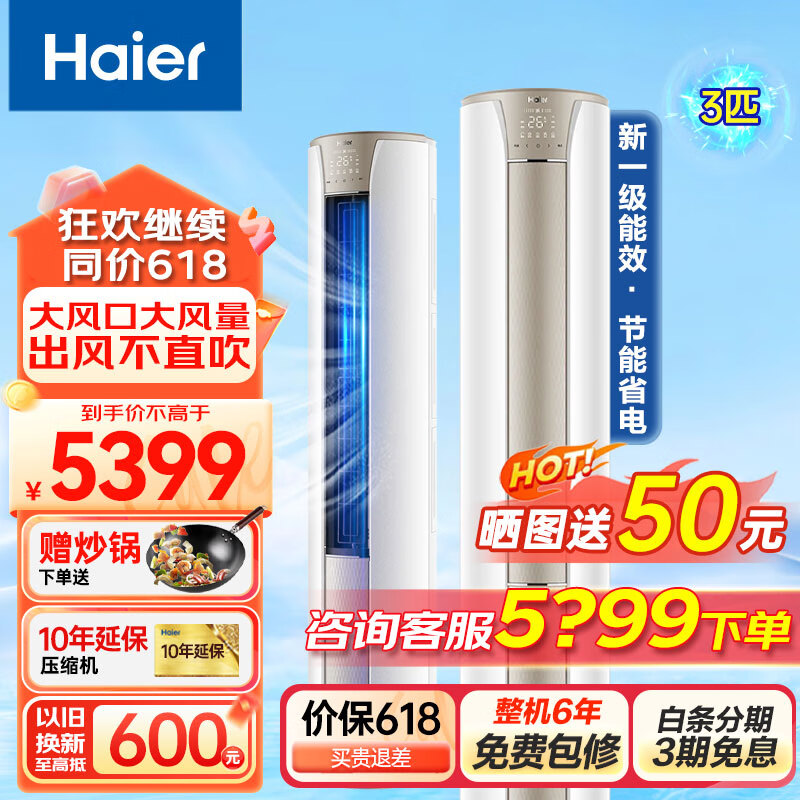 海尔(Haier)空调柜机3匹静悦新一级能效变频冷暖客厅立式圆柱自清洁家用办公空调KFR-72LW/28KCA81U1价格:5399.00元!