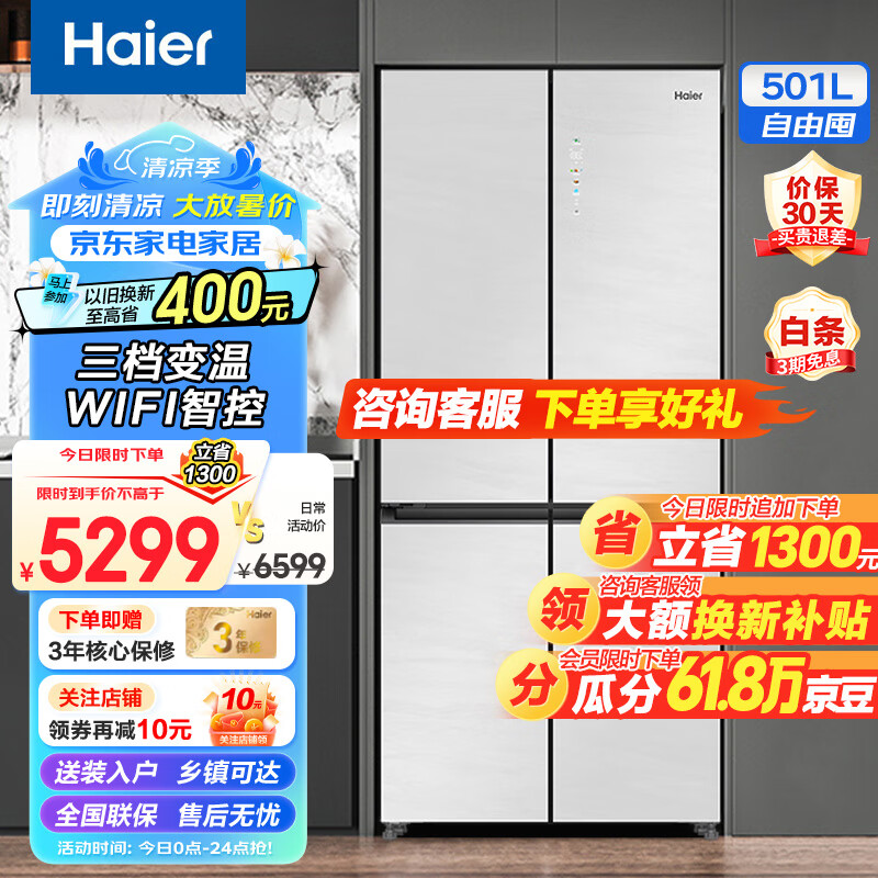 海尔(Haier)冰箱501升十字对开门四开门一级变频风冷无霜三重杀菌彩膜显示屏母婴专属家用大容量价格:5599.00元!