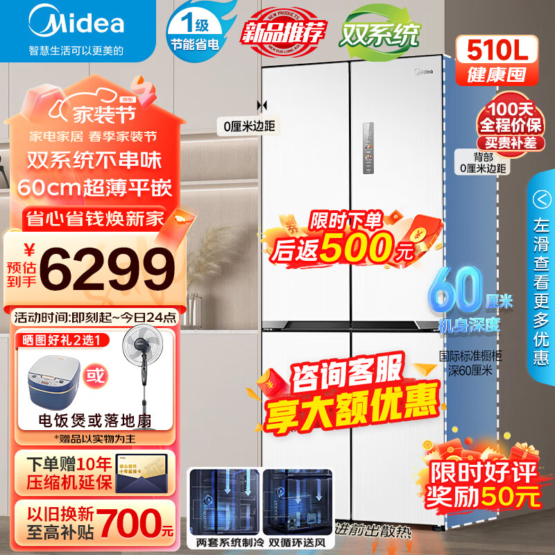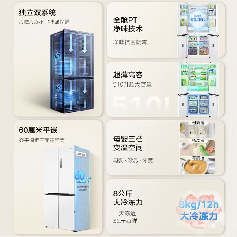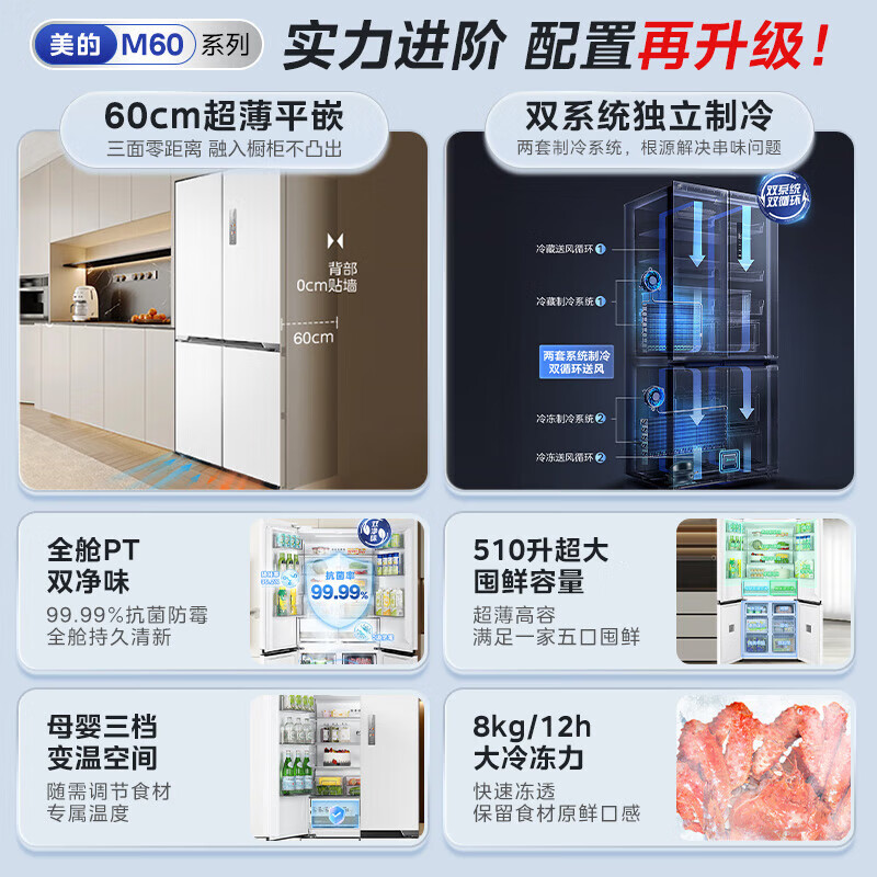 美的(Midea)M60电冰箱535十字对双开门超薄零嵌一级双系统循环变频风冷无霜大容量除菌净味智能 MR-535WUSPZE价格:7299.00元!
