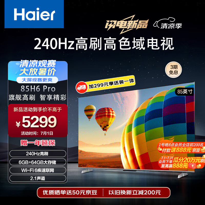 海尔(Haier)85H6 Pro 85英寸电视 4K超高清240Hz屏 6+64GB 大屏电视智能液晶平板电视机以旧换新价格:5299.00元!