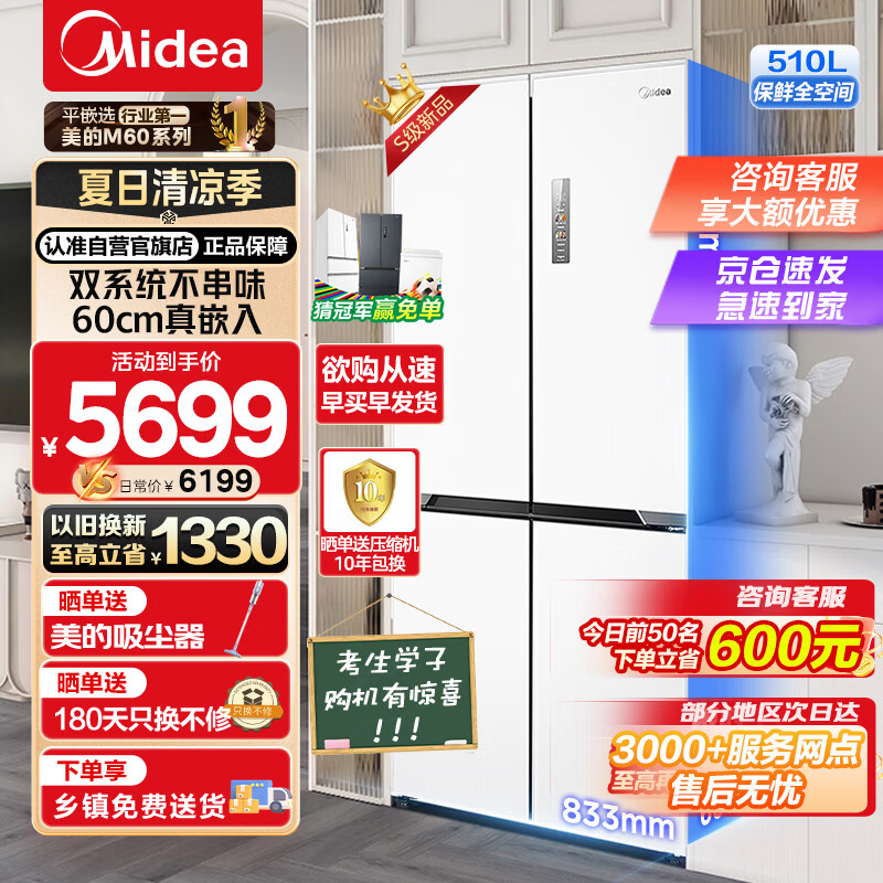 美的(Midea)M60系列535十字对开门四开门双系统双循环超薄嵌入式变频无霜大容量家用智能冰箱MR-535WUSPZE价格:6299.00元!