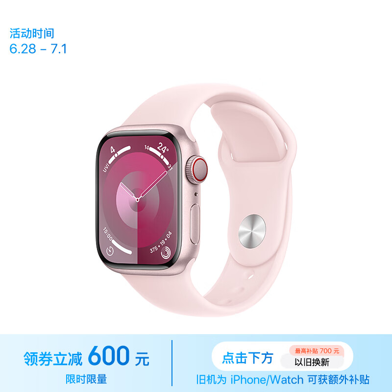 Apple/苹果 Watch Series 9 智能手表GPS+蜂窝款41毫米粉色铝金属表壳亮粉色运动型表带M/L MRJQ3CH/A价格:3799.00元!