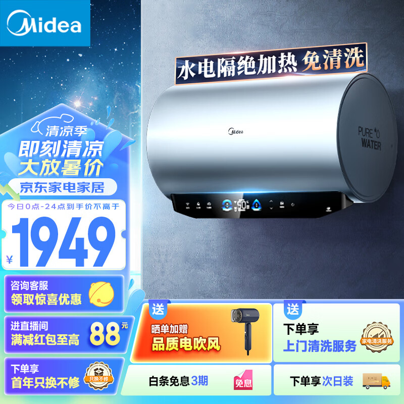美的(Midea)水电分离80升电热水器家用 3300W变频5G速热 10重过滤净肤瓷净舱内胆免清洗以旧换新F8033-PE8(HE)价格:2149.00元!
