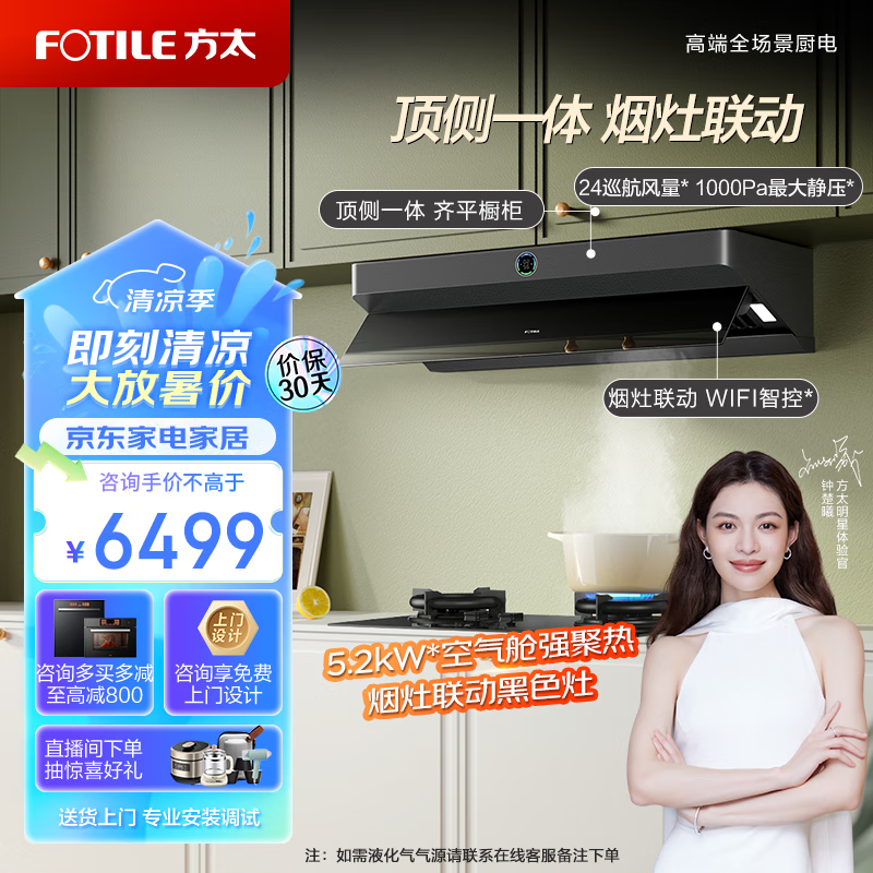 方太(FOTILE)F2抽吸油烟机灶具套装 顶侧一体齐平橱柜 24巡航风量 5.2kW烟灶联动套餐01-F2.i+TE22价格:6499.00元!