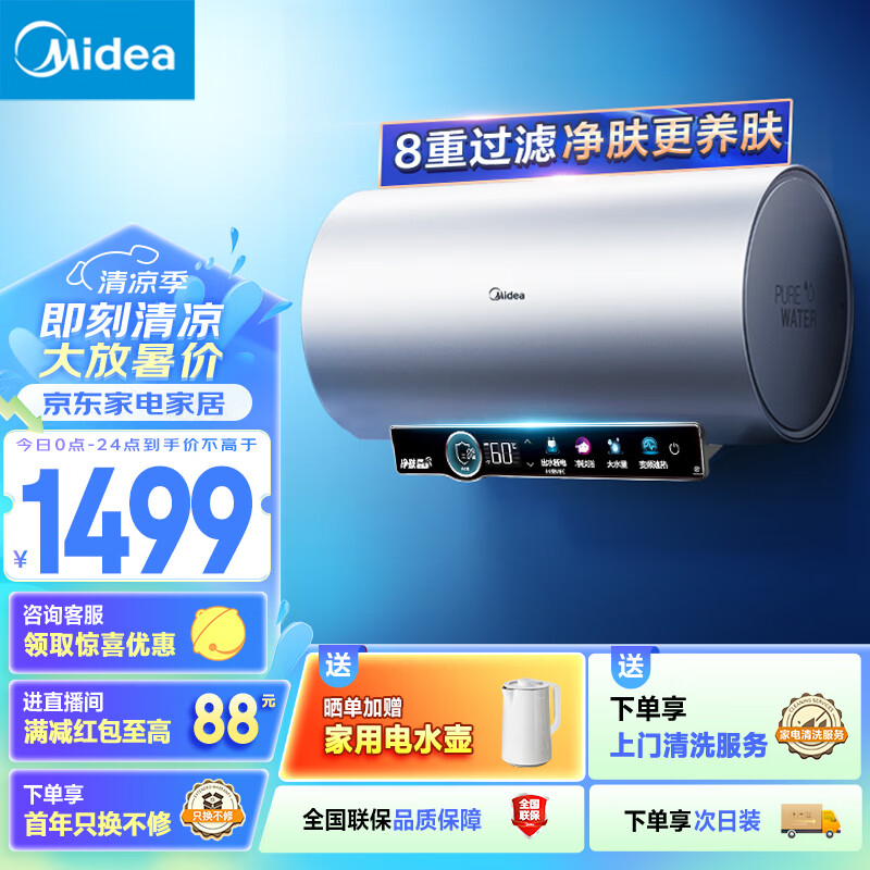美的(Midea)净肤洗电热水器80升家用 3300W变频 出水断电 镁棒免更换 一级能效以旧换新F8032-JA7(HE)价格:1599.00元!