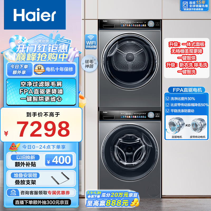 海尔(Haier)PRO81洗烘套装 10KG直驱滚筒洗衣机全自动+空净热泵烘干机家用 双重除毛屑 PRO81U1+181 以旧换新价格:7298.00元!