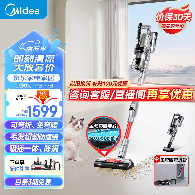 美的(Midea)吸尘器家用Q8 Pro 无线手持吸拖一体机 除螨仪宠物地毯洗地机价格:1599.00元!