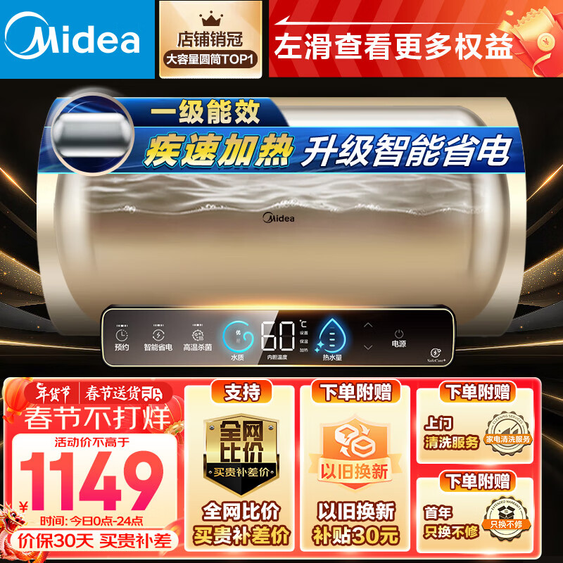 美的(Midea)家用80升3300W大功率电热水器速热大水量健康水质监测珐琅无缝内胆一级能效智能省电F8032-JE3(HE)价格:1349.00元!