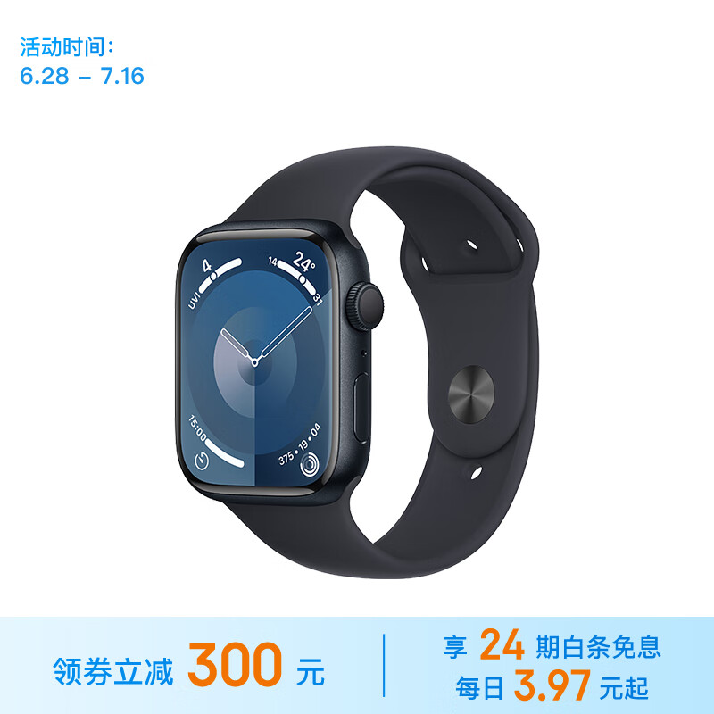 Apple【24期免息】Watch Series 9智能手表GPS款45毫米午夜色铝金属表壳午夜色表带S/M MR993CH/A价格:3199.00元!
