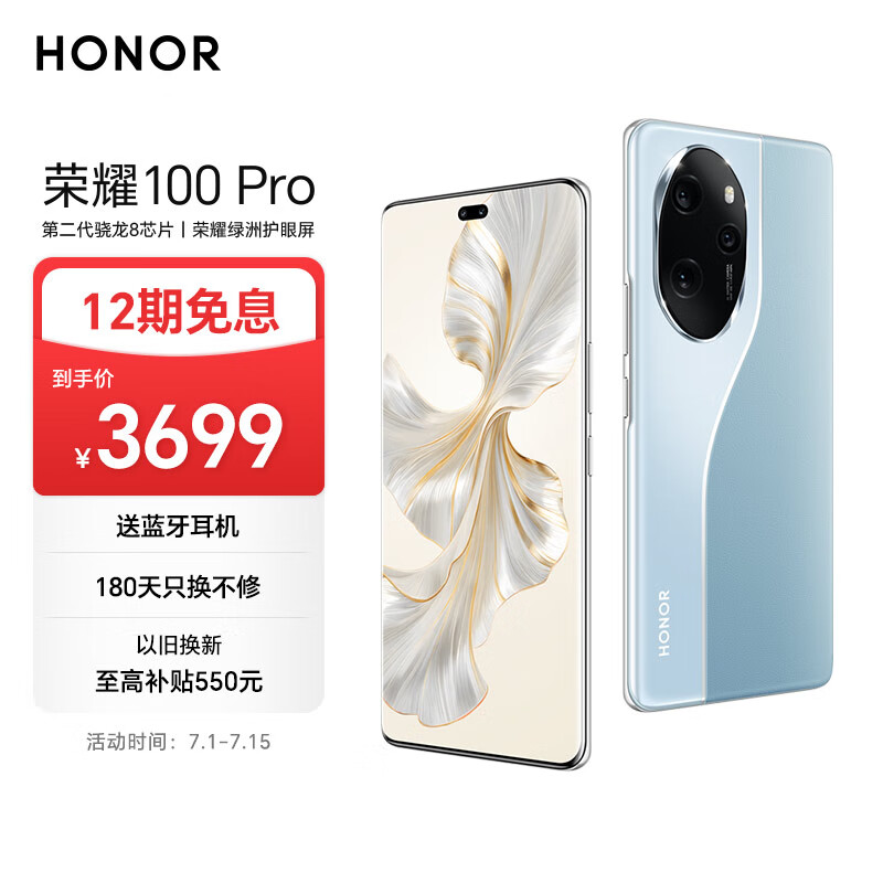 荣耀100 Pro 单反级主摄 荣耀绿洲护眼屏 第二代骁龙8旗舰芯片 AI手机 16+256 迷蝶蓝 5G价格:3699.00元!