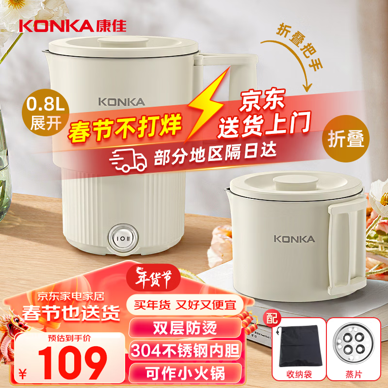 康佳(KONKA)电热水壶 便携式烧水壶折叠304不锈钢开水壶 烧水杯旅行出差家用养生冲奶学生泡面杯 KDSH-0838-W价格:109.00元!