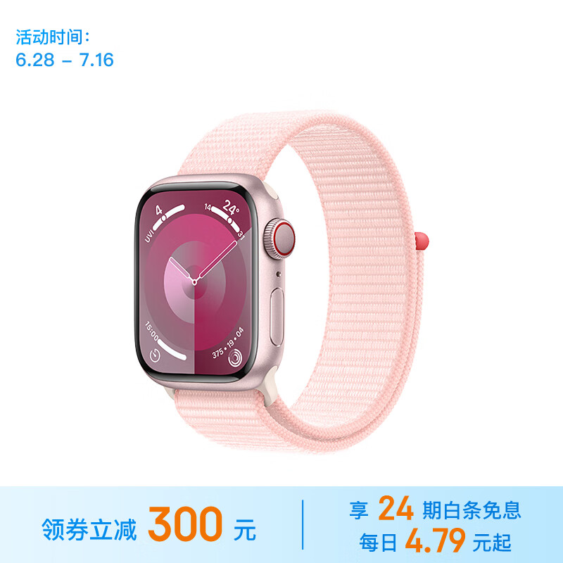 Apple【24期免息】Watch Series 9智能手表蜂窝款41毫米粉色铝金属表壳亮粉色回环表带MRJR3CH/A价格:3799.00元!