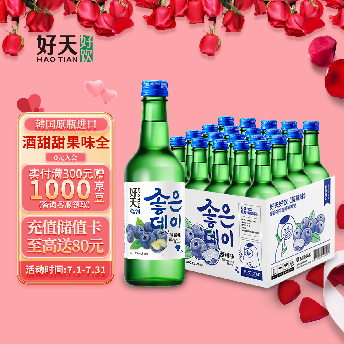 好天好饮韩国烧酒 蓝莓味 13.5度 原瓶进口 低度微醺 360ml*20瓶 整箱装价格:208.00元!