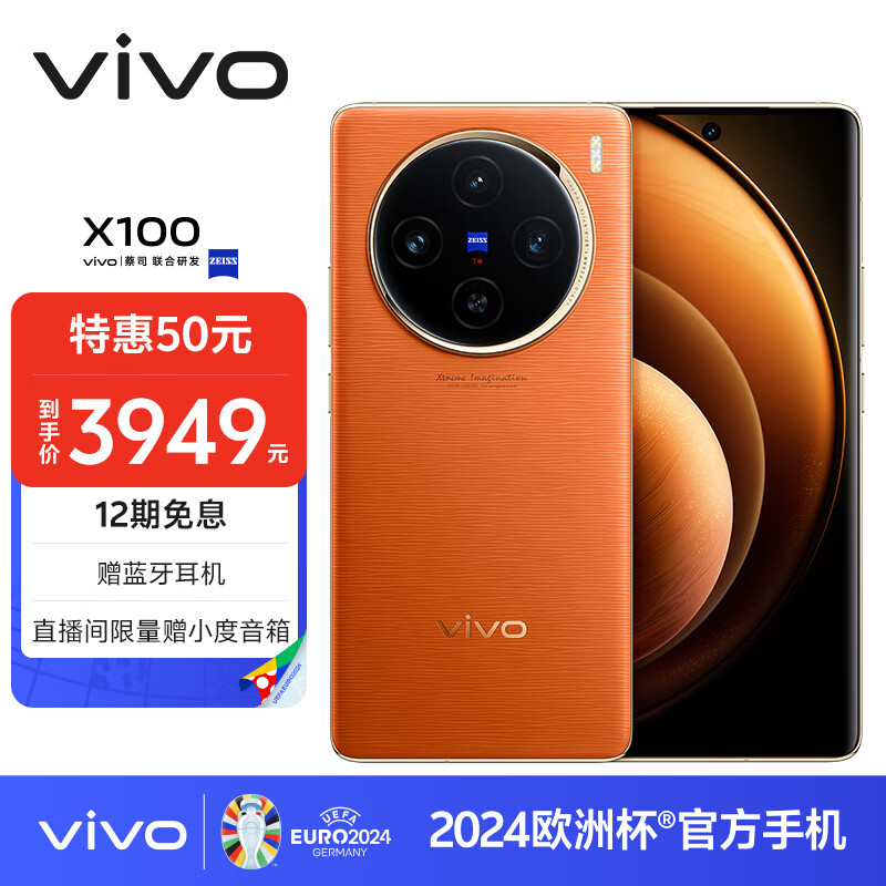 vivo X100 12GB+256GB 落日橙 蓝晶×天玑9300 5000mAh蓝海电池 蔡司超级长焦 120W双芯闪充 拍照 手机价格:3999.00元!